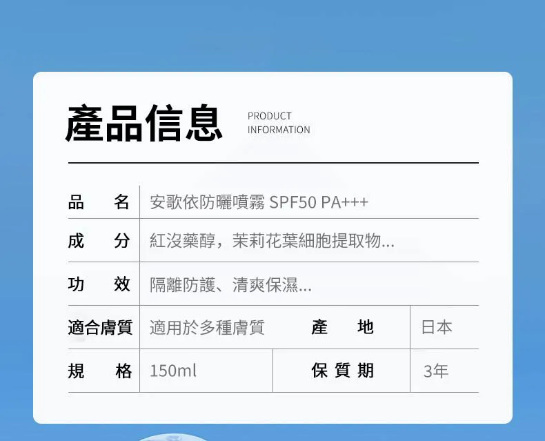 半小時前安歌依光圈防曬噴霧,細密噴頭設計 噴頭360°可旋轉自然膚惑,隔離防曬一瓶搞定 - 限時搶購「安歌依光圈防曬噴霧」2入78%用戶的選擇!NT$998【限時免運】
